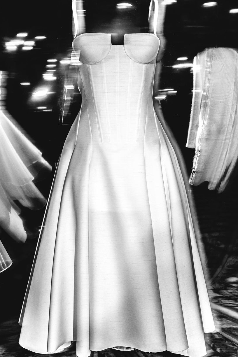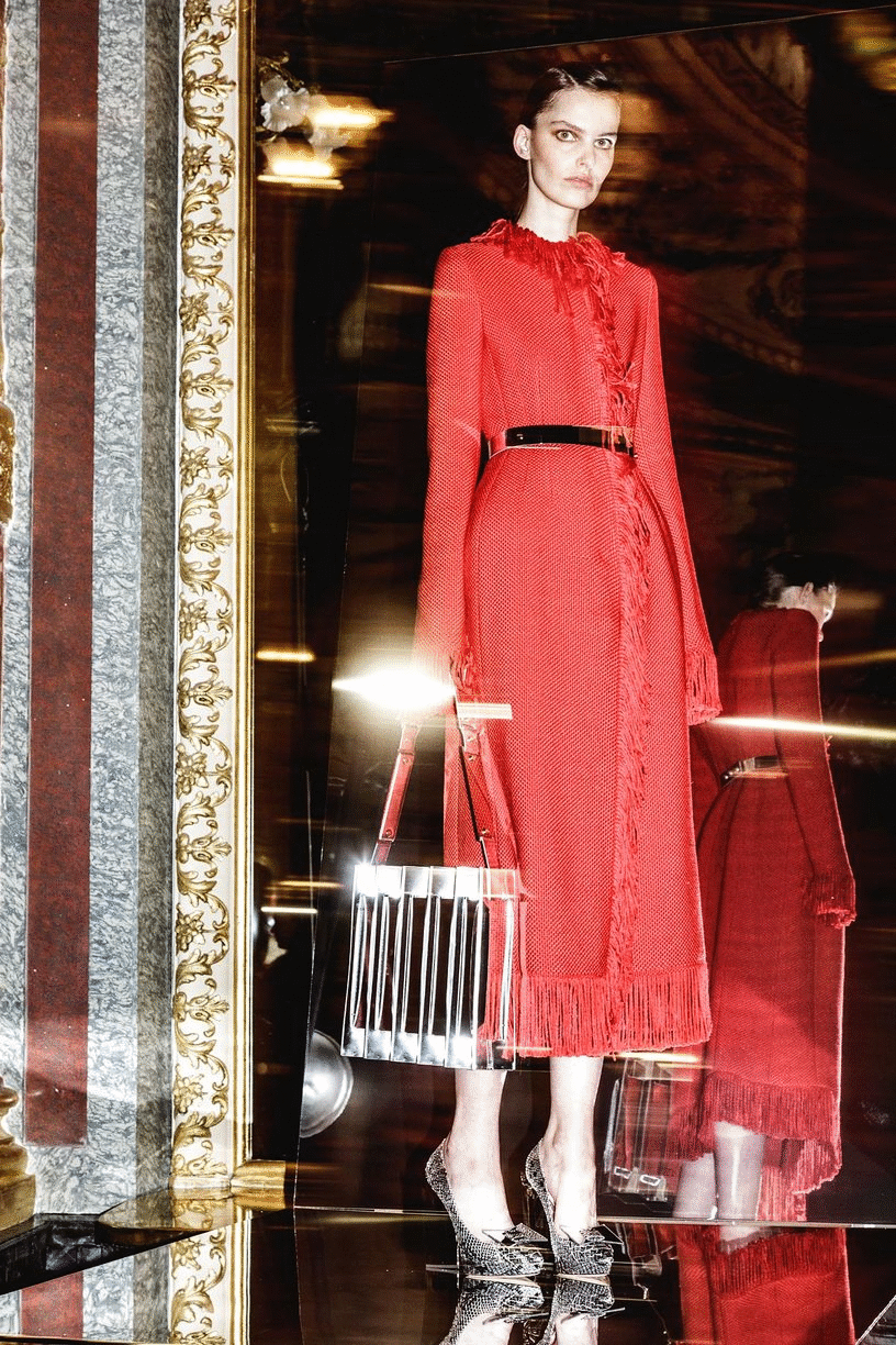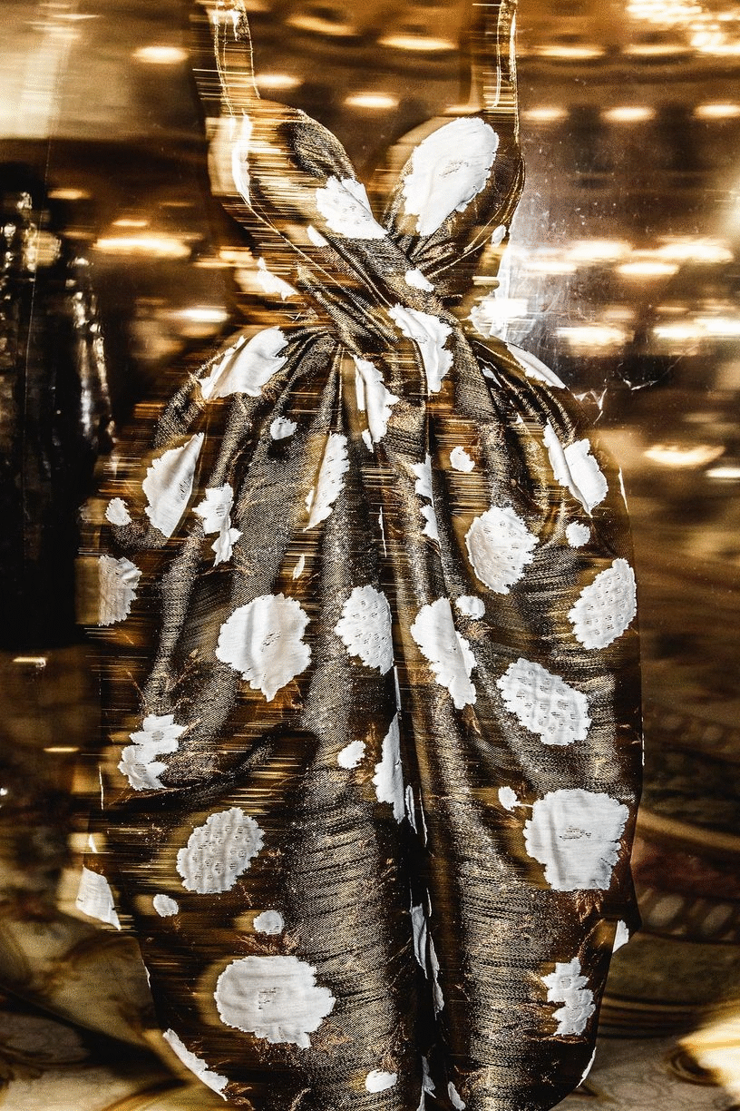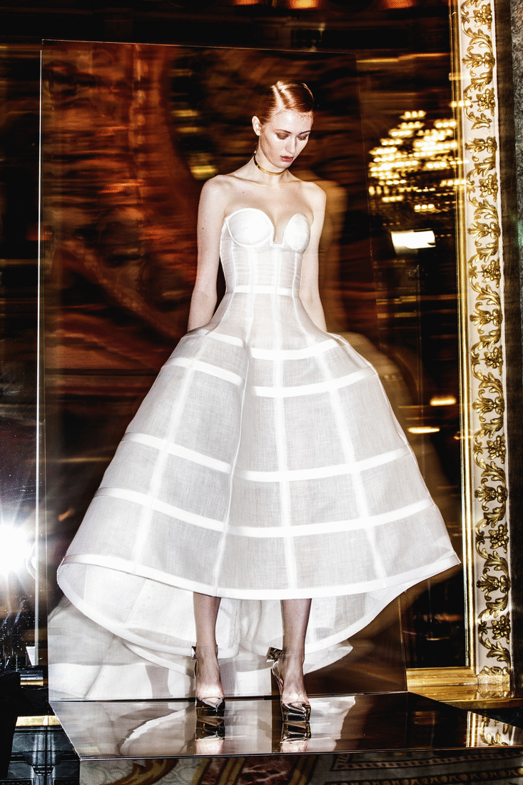 The collection references a study on French Costume and Textiles from the courts of Louis XIV to the exuberance of the Napoleon III era, where golden jaquards, Chantilly laces, lingerie, velvet and crinolines were first developed.