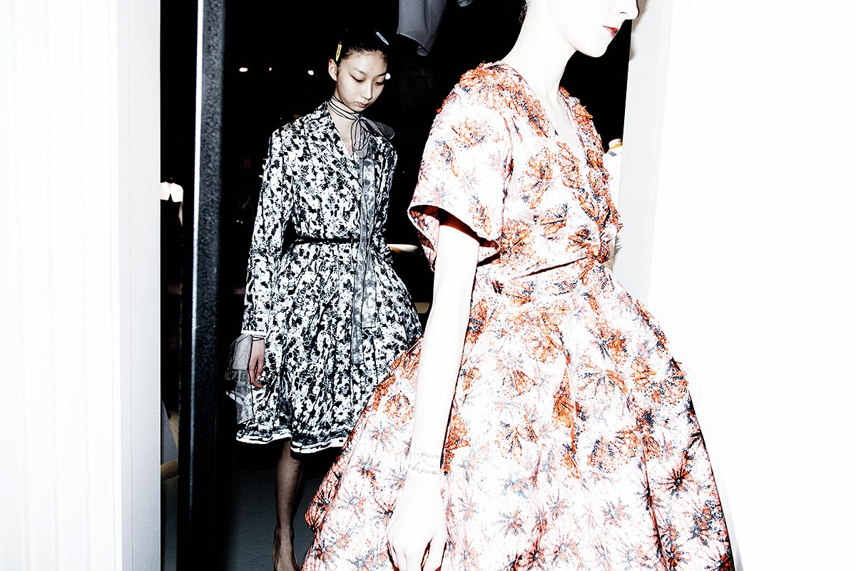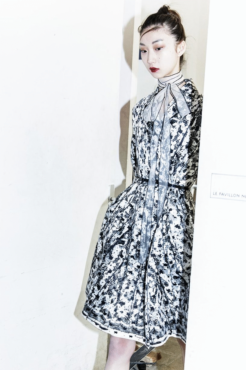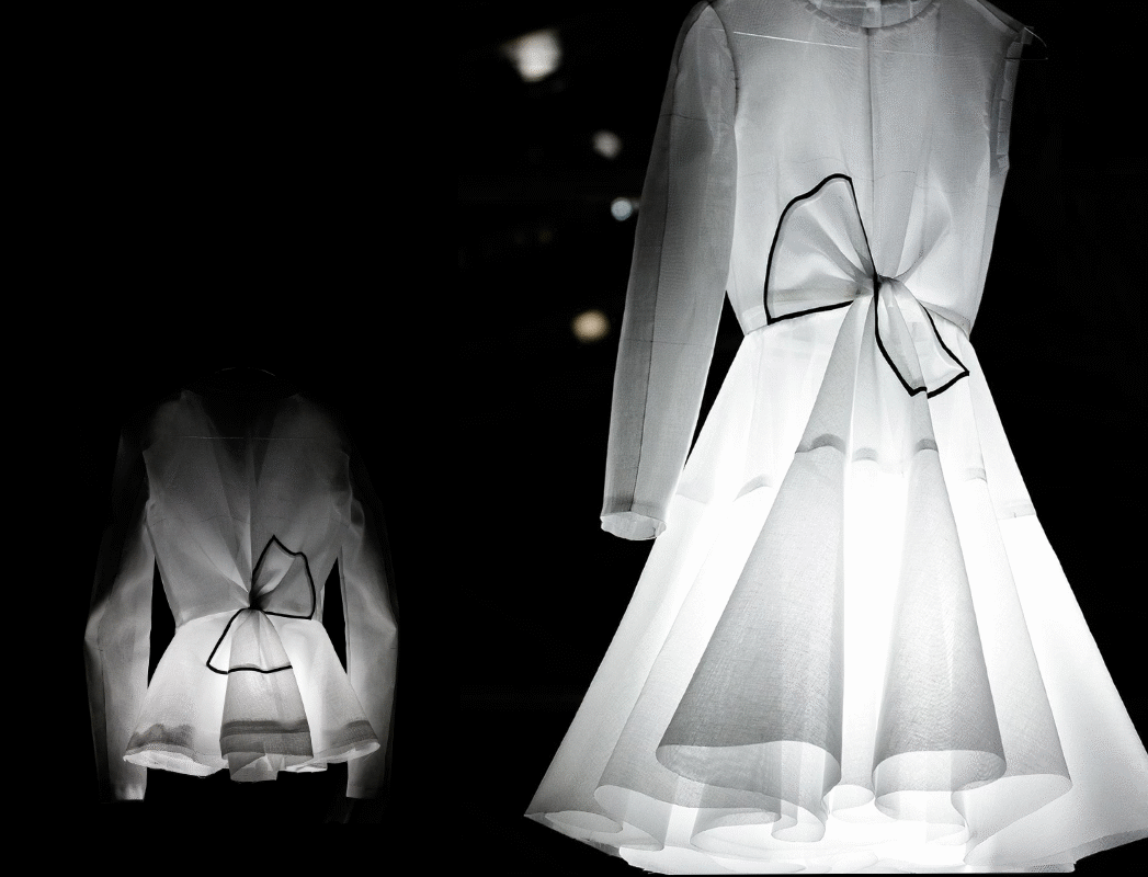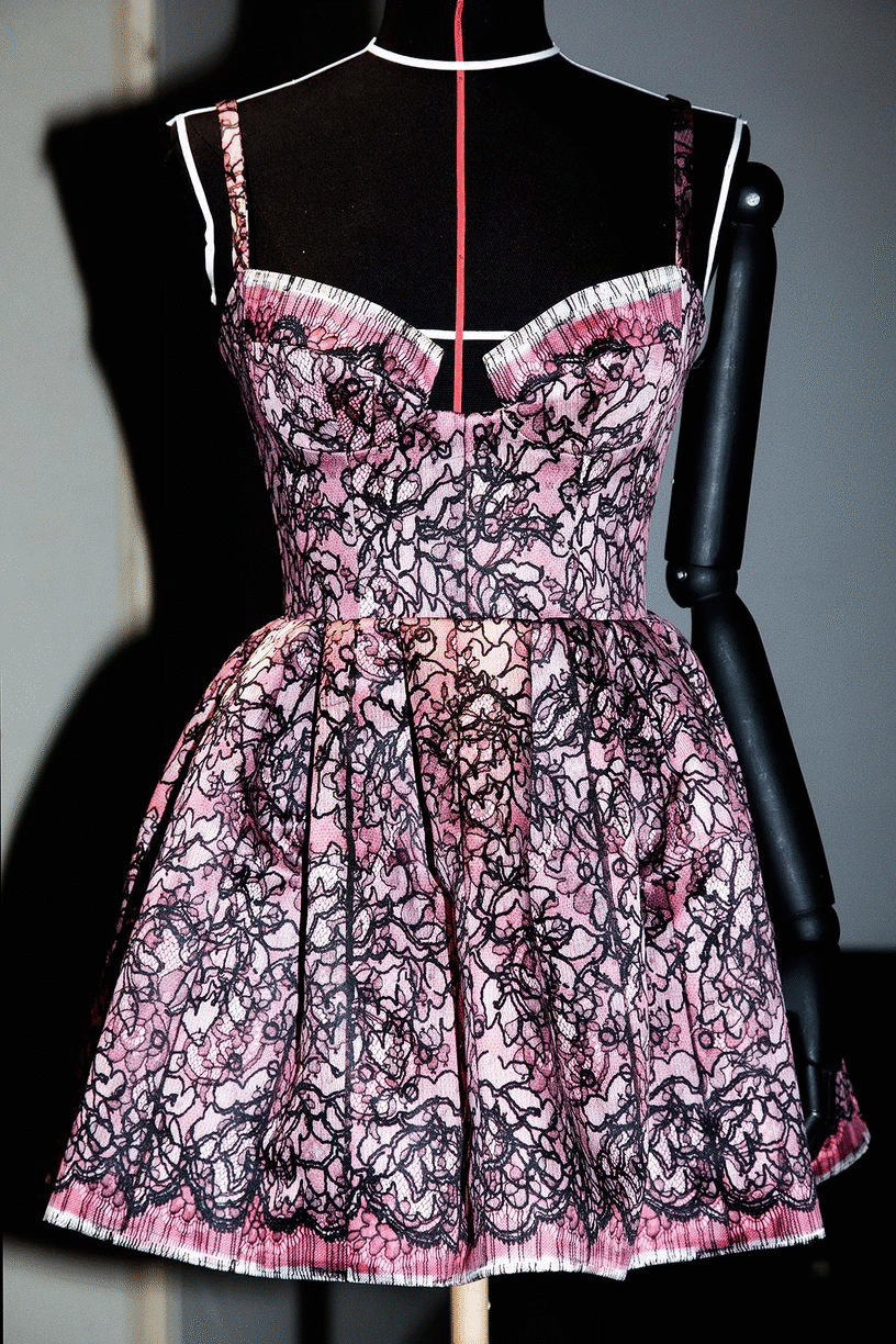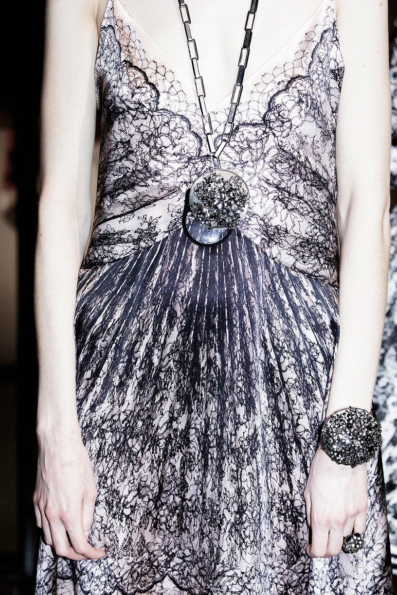 Finally, the guests step into the print room, where the process of colouration is highlighted by reflectors illuminating pleated panels of lace, used to extrapolate the floral motifs of the collection.