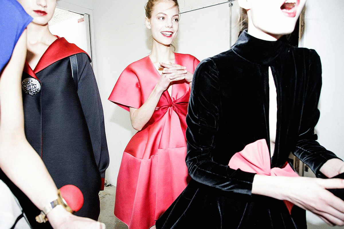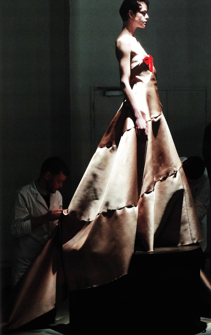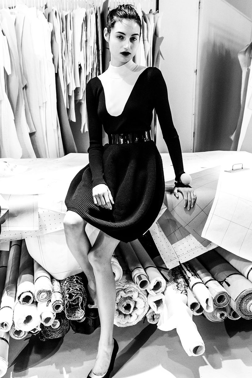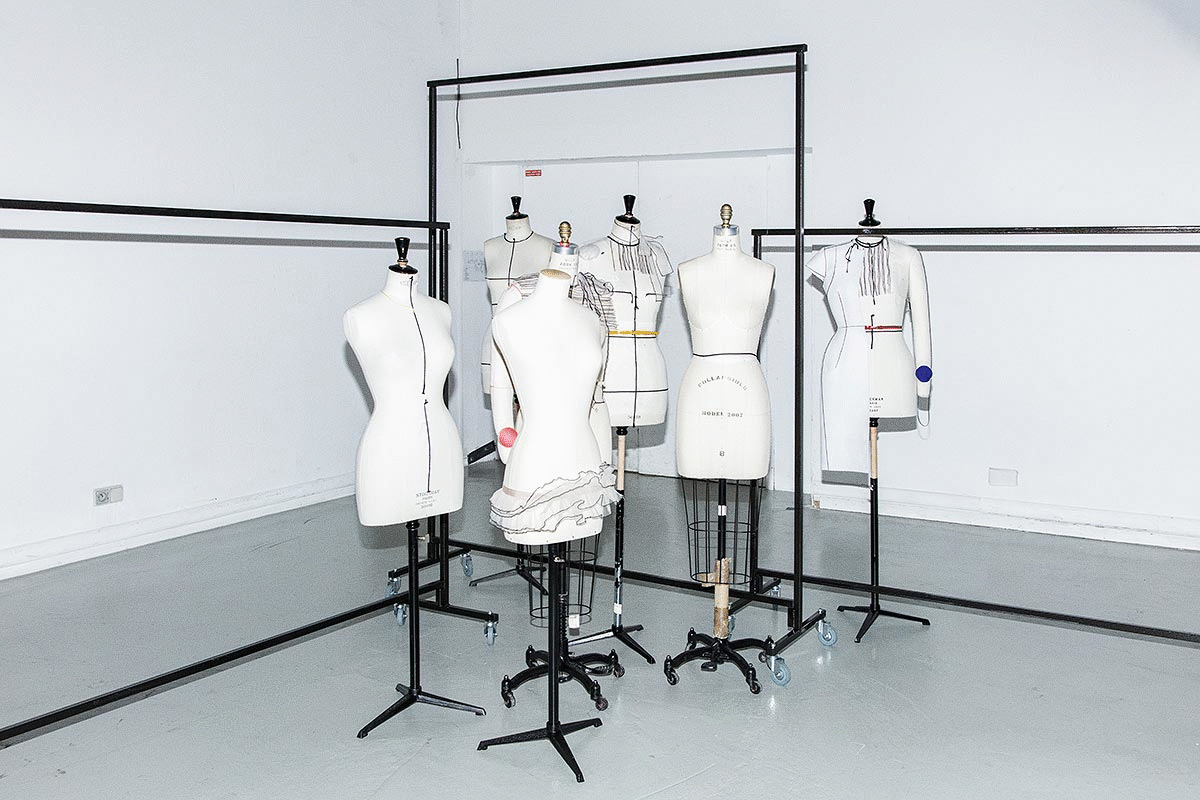 The journey starts in the pattern room, where the white canvas skeletons of the collection pieces are revealed in front of cutting tables and giant pattern blocks, to then continue in the sewing room and the fitting room, where faceted mirrors reflect the garments in the process of being assembled while the models rotate like dolls.